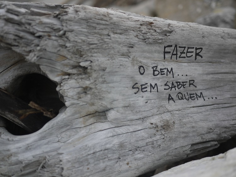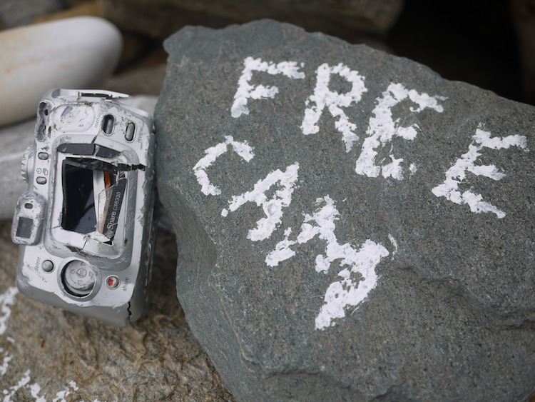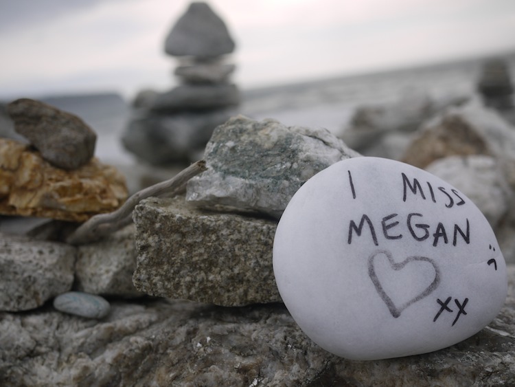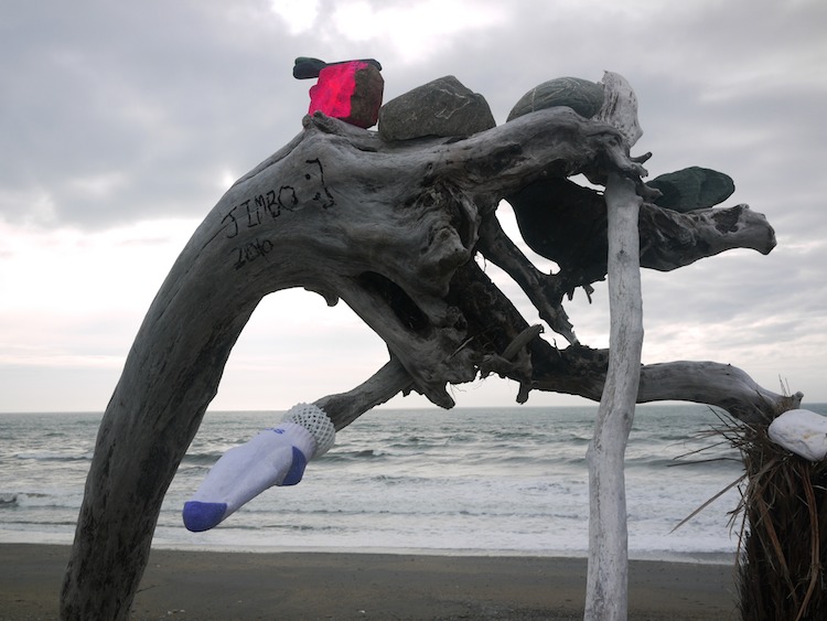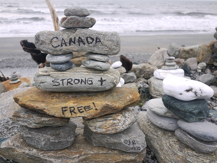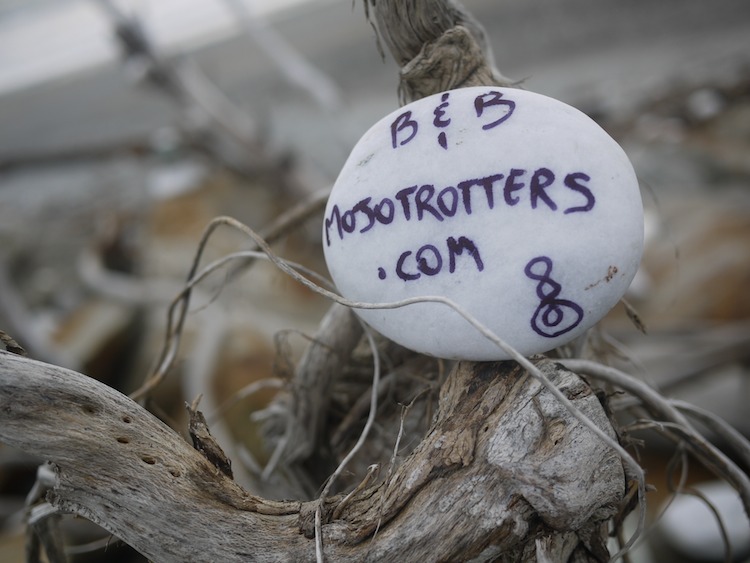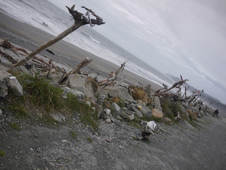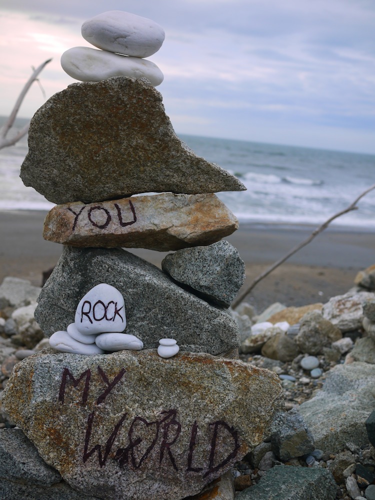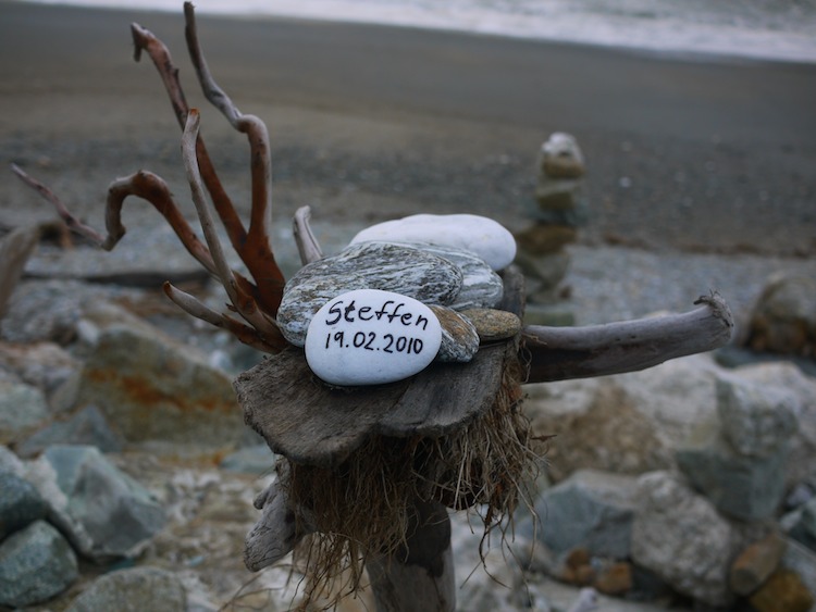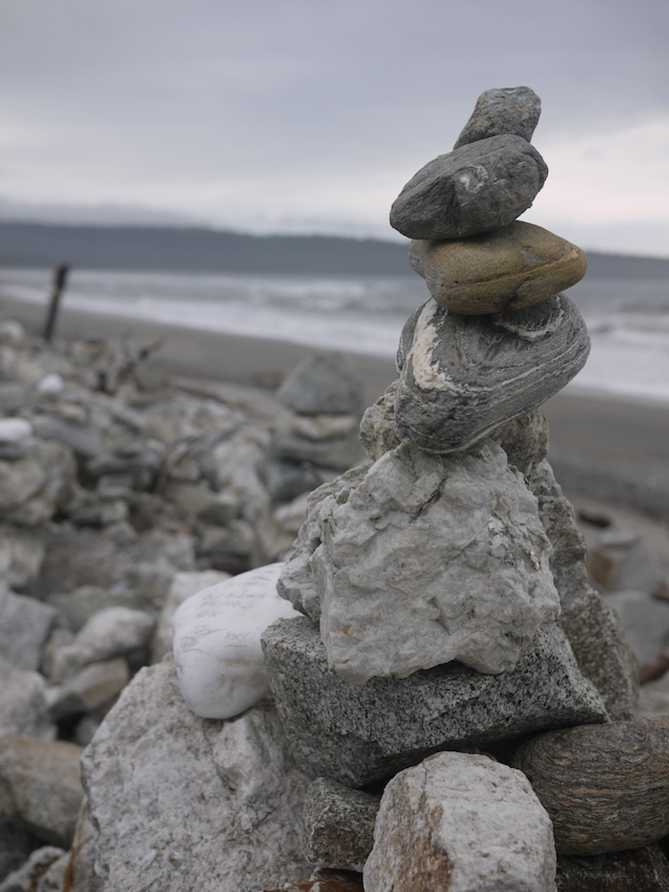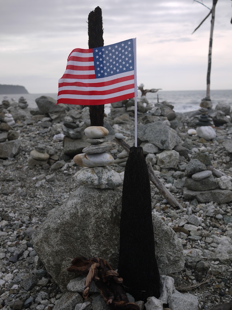Mostly they are pebbles scribbled on with a Sharpie. Others are driftwood branches set upright, towering rock piles, or a simple national flag.