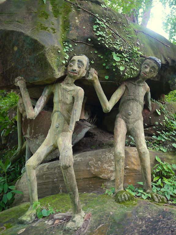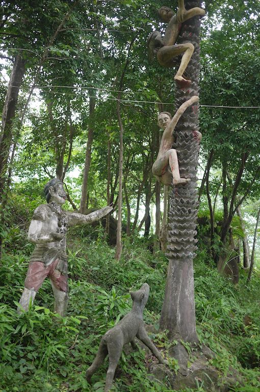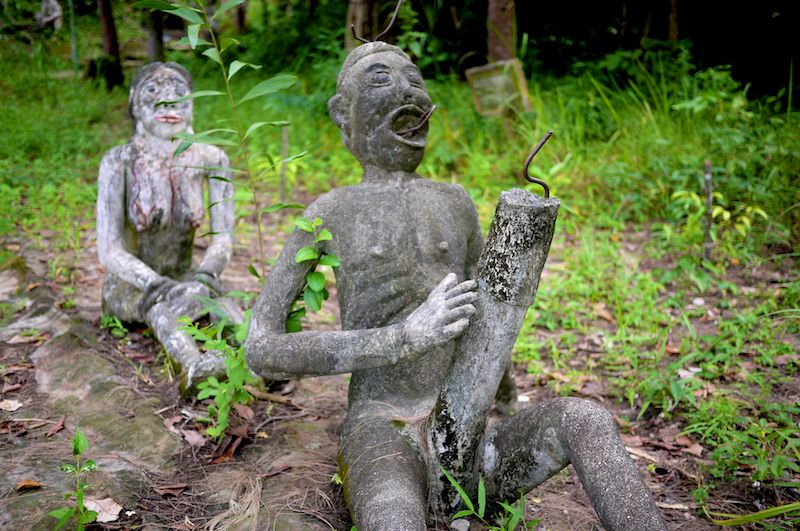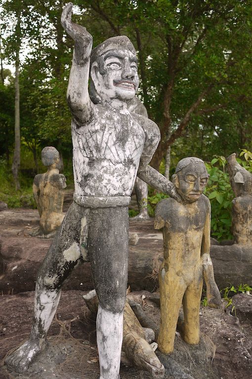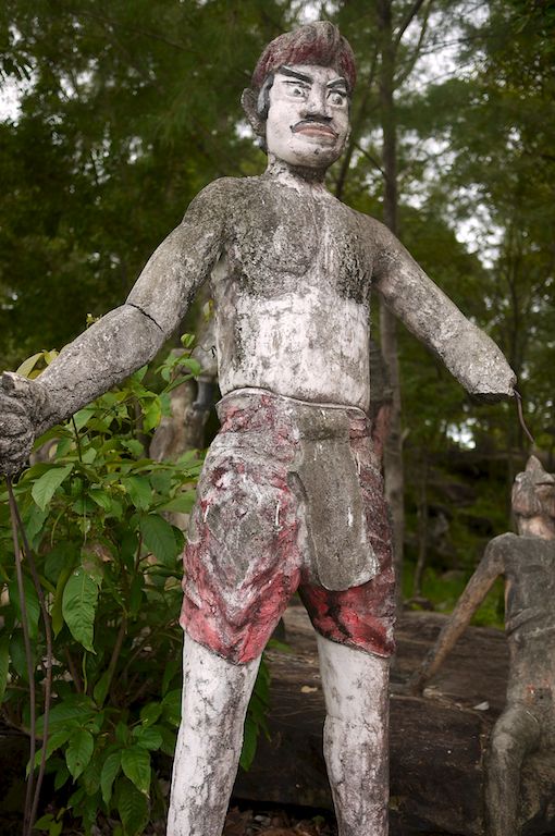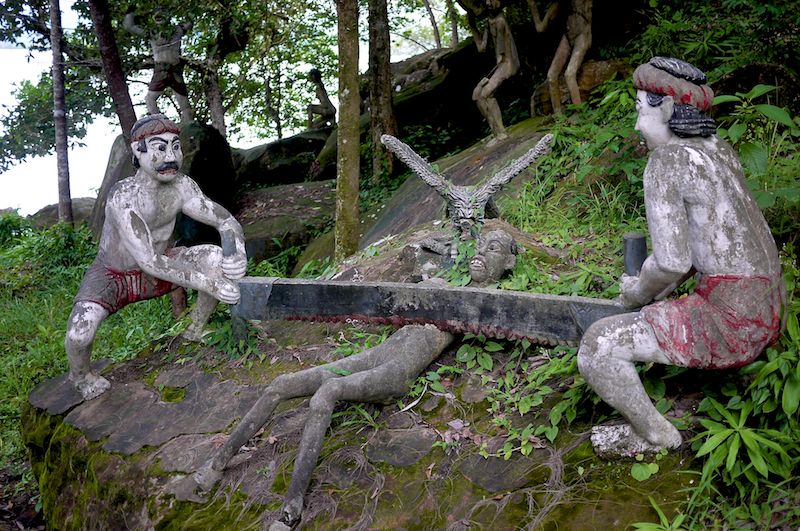 In the photos below you’ll see sadistic-looking sculptures killing people with the heads of animals. You’ll see a man being sawed in half while being pecked by a garuda, a bird of Buddhist mythology.