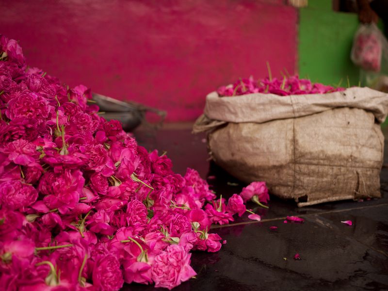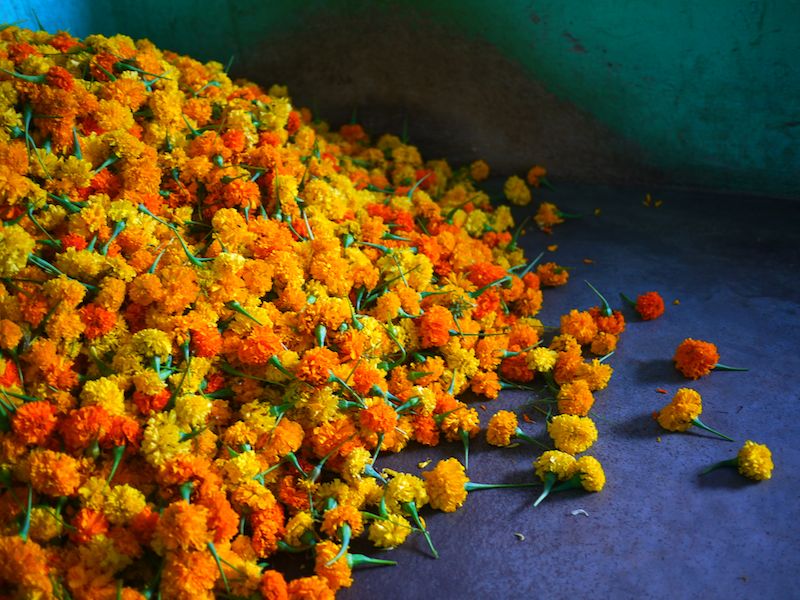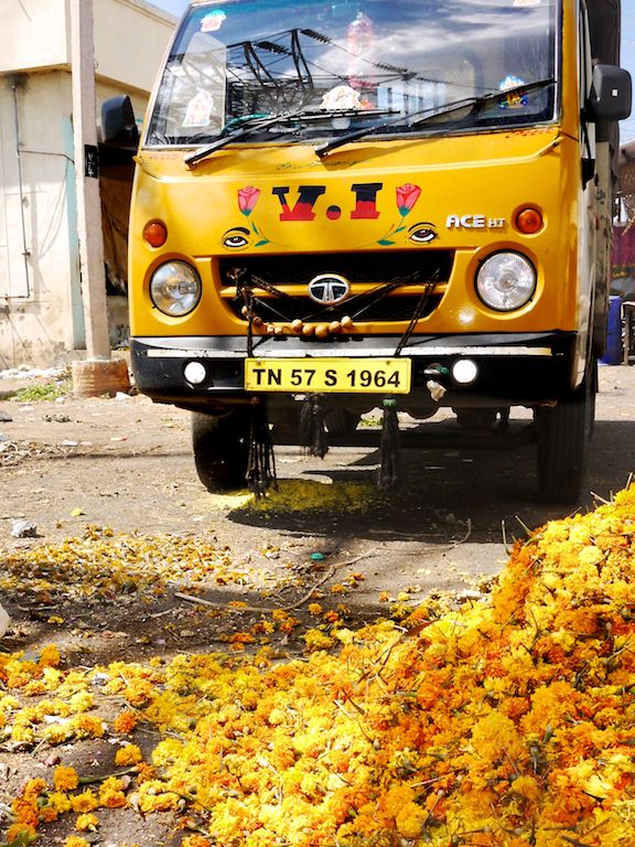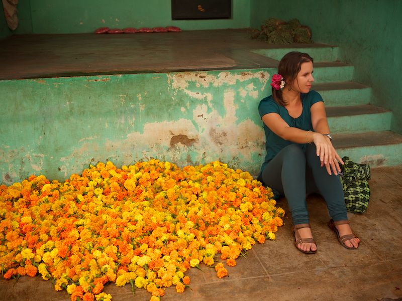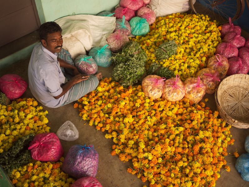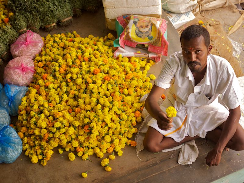 In India, even the flower market is run by men. Strewn with refuse and dead flowers, it’s a place that doesn’t charm at first sight. The peeling walls are patched with old movie posters. “So this is the place my guidebook suggested,” I doubted silently.