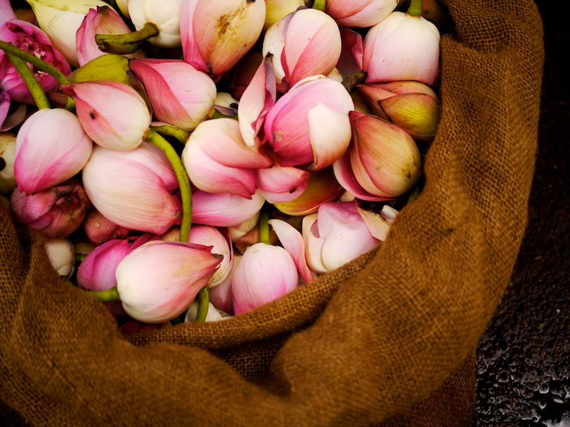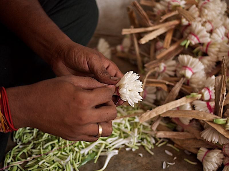 But the merchants ask to be photographed, offer delightfully fragrant blossoms, and create skillful arrangements to adorn women’s hair or as offerings to the gods. And the experience transforms little by little.
